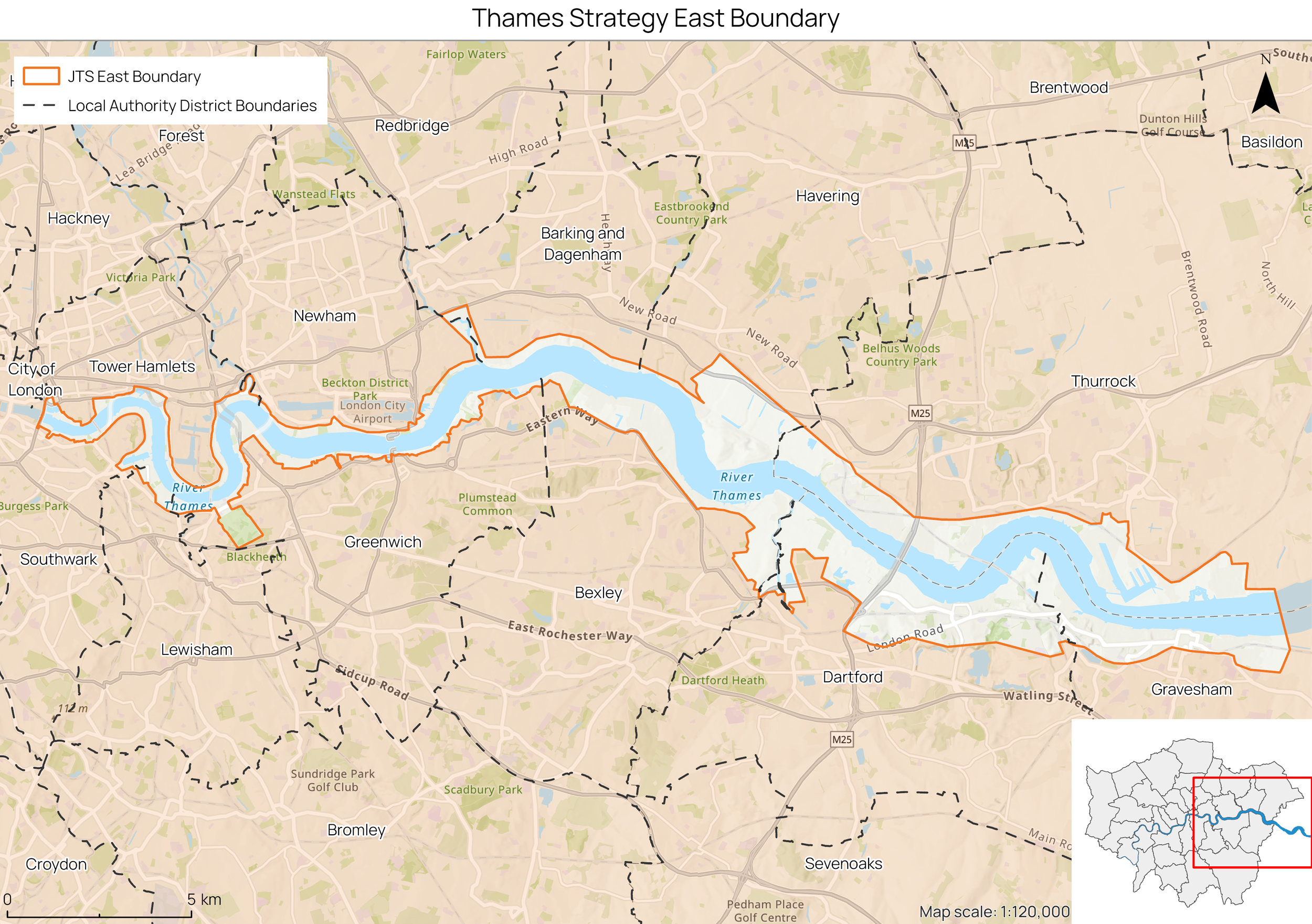 Each of the strategies led by TEP encompass an area within the Thames Policy Area. For Thames Strategy London Central, the area between Chelsea Bridge and Tower Bridge, and for Thames Strategy East, the area between Tower Bridge and Gravesend/Thurrock.